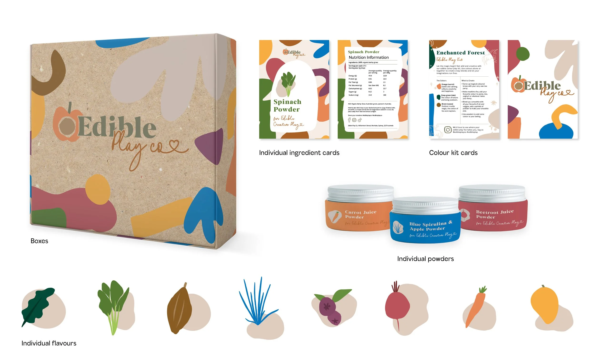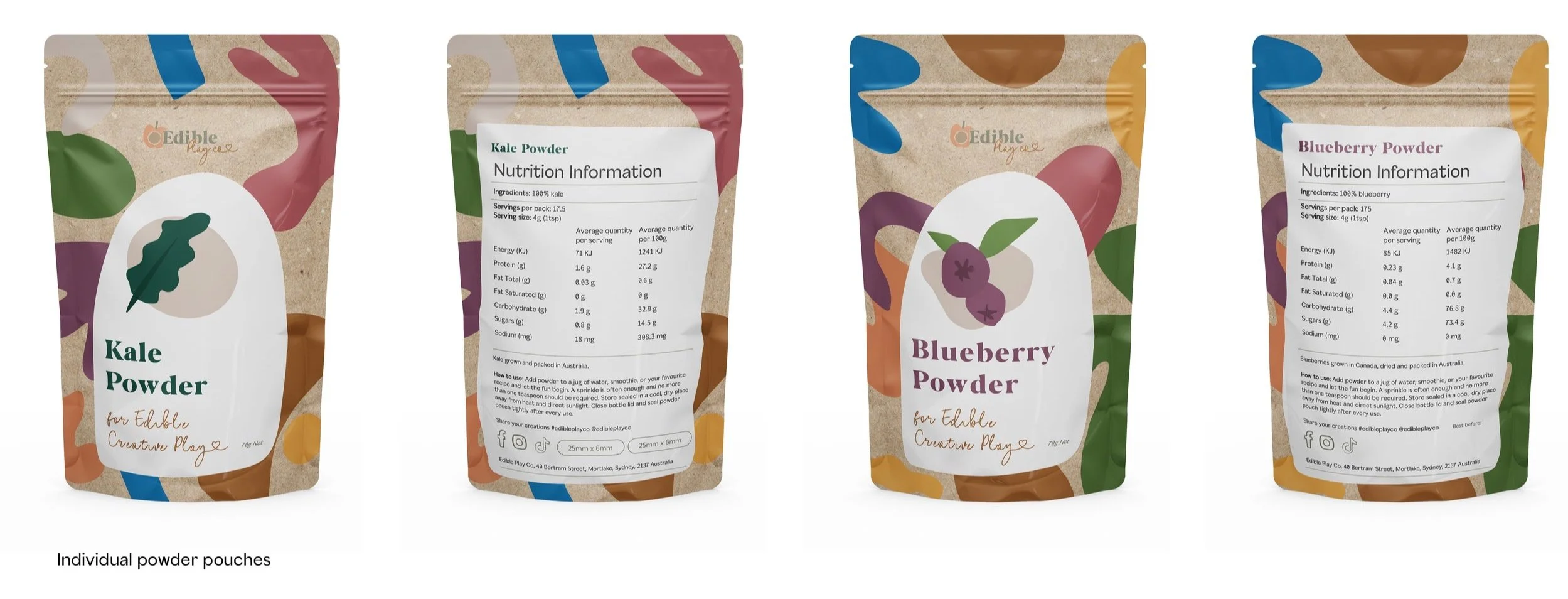Edible Play co caters to a youthful audience, providing them with edible powders that unleash their creativity by mixing them into various crafts, treats and playtime fun. The logo, the initial focal point, was intricately fashioned, each version aligning with a specific aesthetic that seamlessly extends to all packaging. Following the logo's finalisation, the remaining elements of the brand were developed, encompassing font choices, a harmonious colour palette, distinct flavour identities, and colour kit representations.